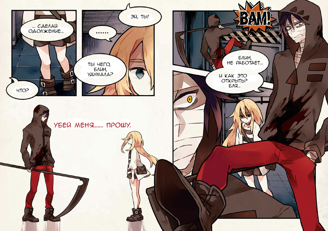 — Убить тебя легко, но я не в настроении, когда у тебя такая чертовски скучная мордашка. Так что, когда мы выйдем на улицу, ты сможешь показать мне личико поприятнее, агась? — Глядя в её безразличное лицо, Зак смеётся, как озорной ребёнок. — Итак, когда мы выберемся отсюда вместе... БАМ! И я убью тебя.