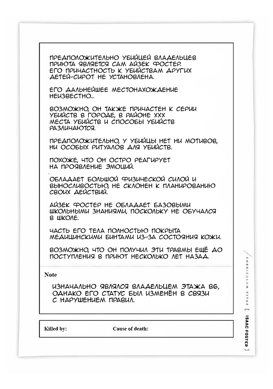 — Не особо. Я просто пришёл сюда, потому что мне сказали, что я смогу убивать, кого захочу. Думаю, другие хозяева этажей такие же… Я не знаю подробностей. — Смутно он вспоминает, как его пригласили в это место. Но он не может вспомнить, сколько лет назад это было — он забыл.