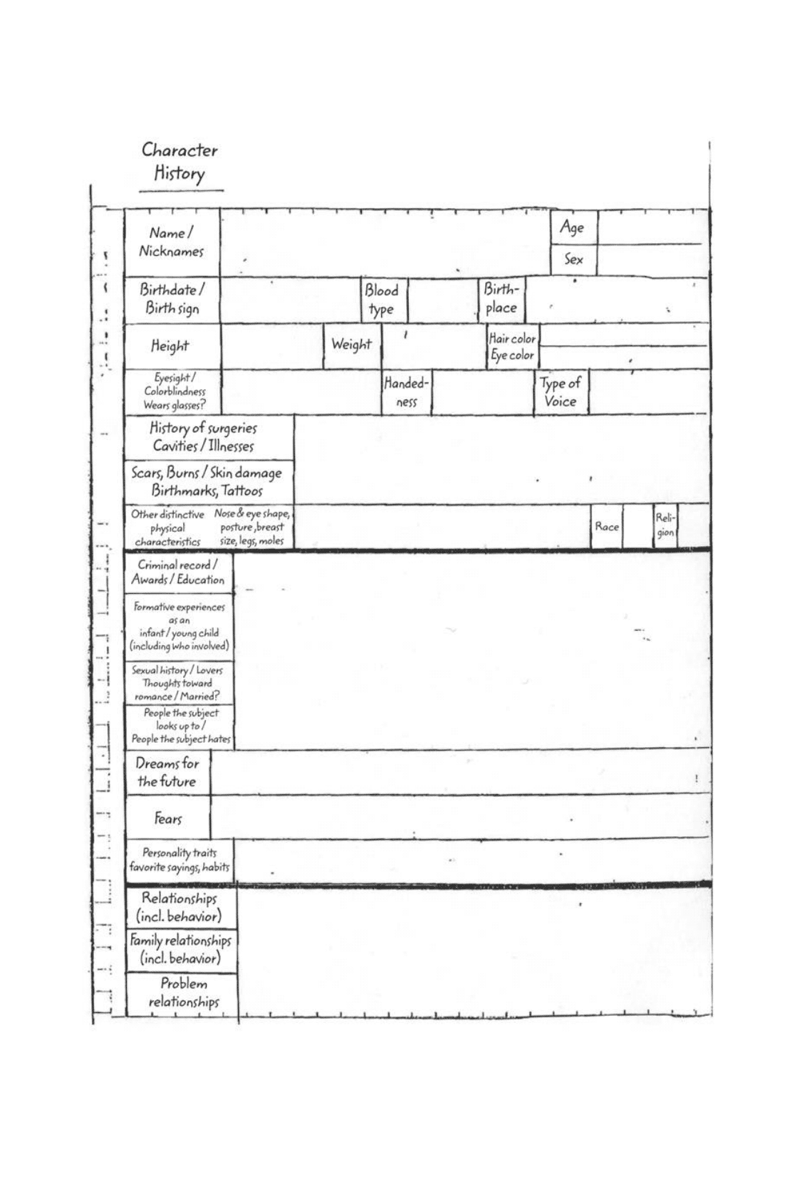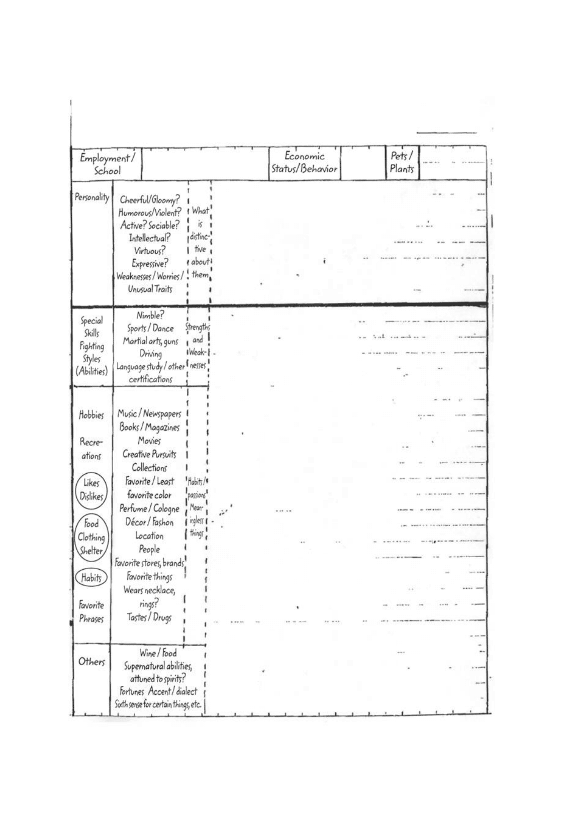 Мои истории персонажей включают примерно шестьдесят пунктов, охватывающих широкий диапазон тем. Я использовал типичное резюме в качестве шаблона, к которому постоянно добавляю дополнительные темы при необходимости, чтобы развить характеры моих персонажей.