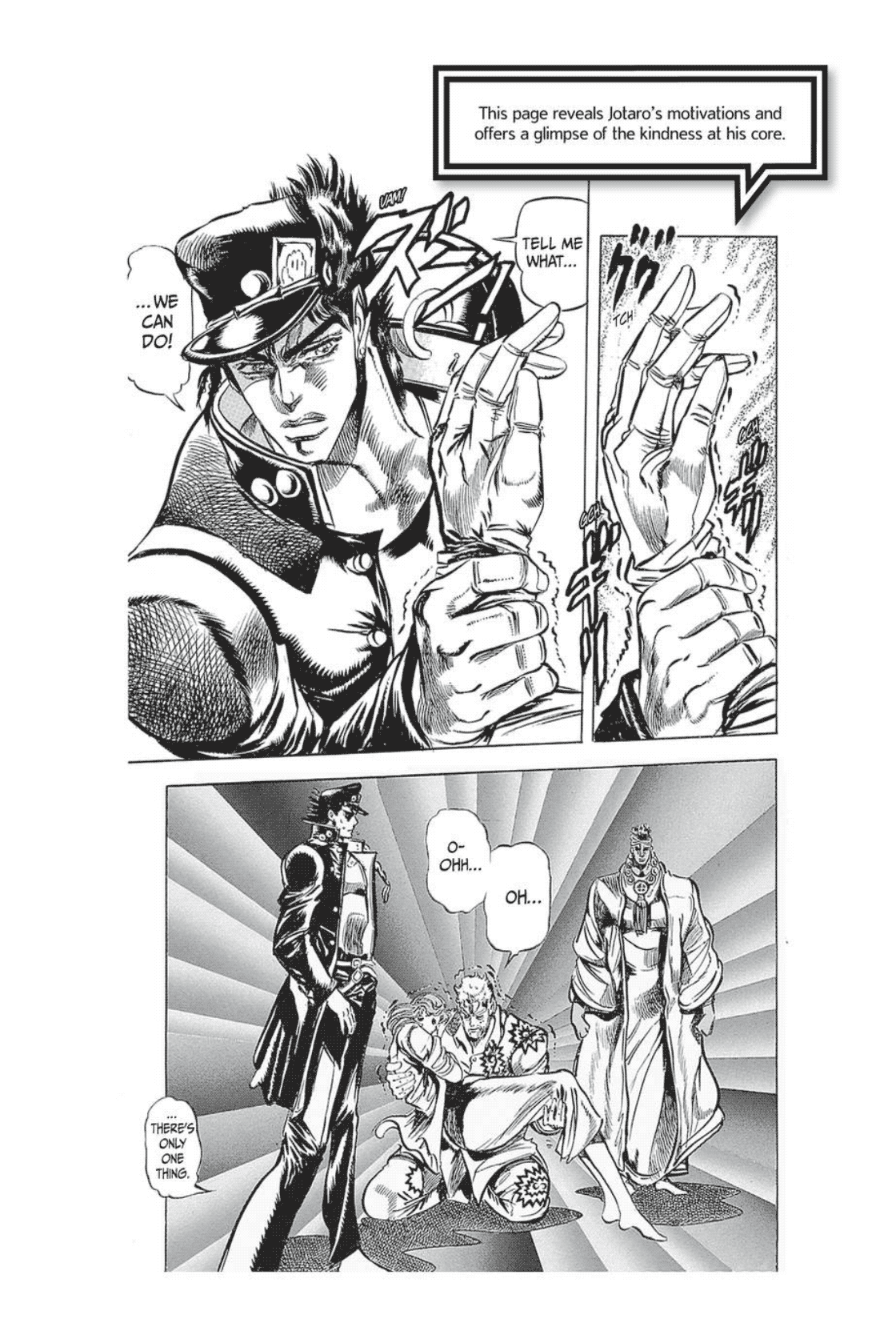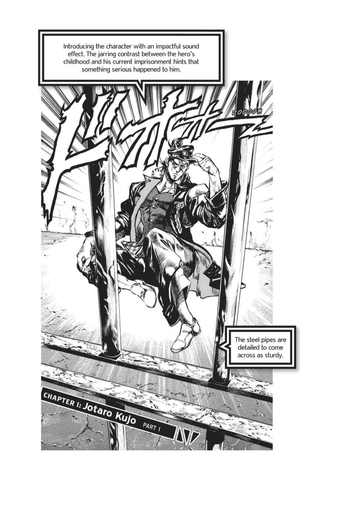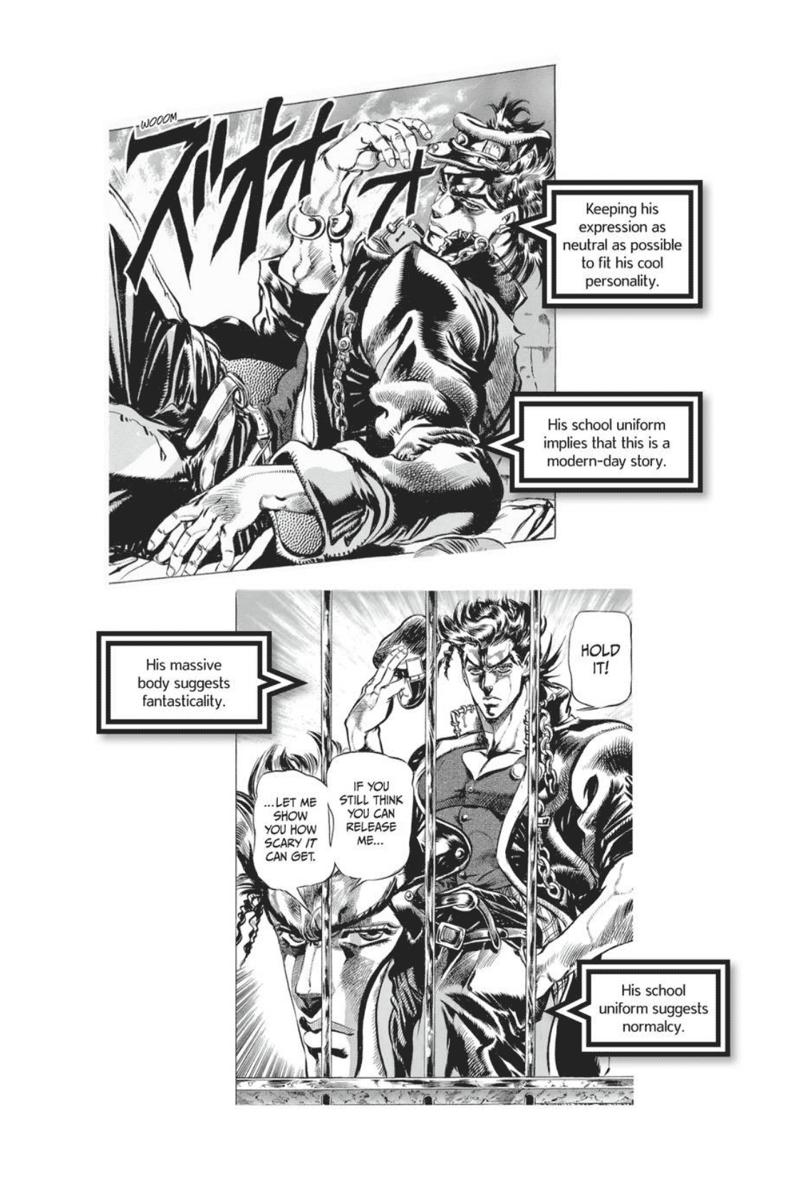 Для того, чтобы ограничить свои насильственные способности, выходящие за его контроль, Джотаро сажает себя в тюрьму и даже пытается покончить с собой, но неизвестная сила останавливает его. Это необычное открытие является прекрасным примером мира JoJo. Кроме того, чем более безопасной была тюрьма, тем больший вес имели бы действия Джотаро, поэтому я уделил большое внимание рисованию ячейки с крепкими металлическими прутьями и другими подобными деталями.