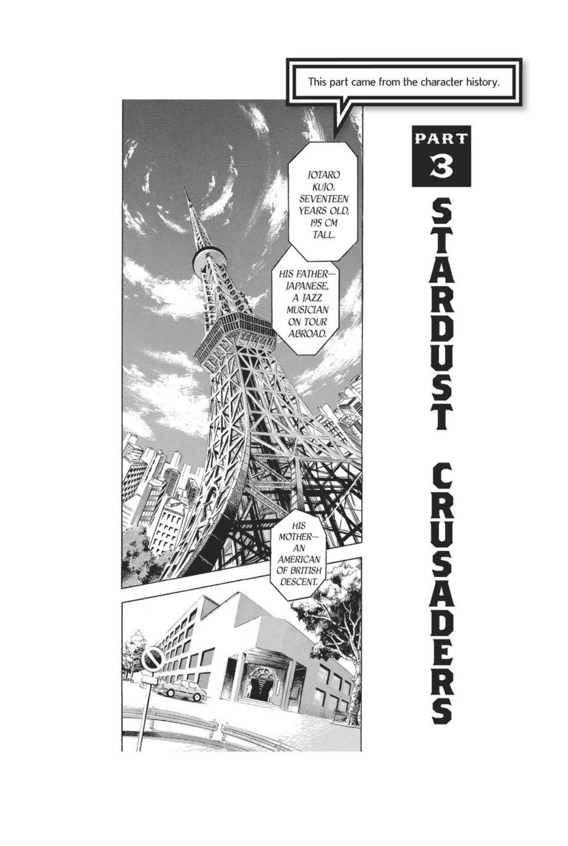 Когда я начал работать над этой историей, моя главная цель заключалась в создании персонажей с различными личностями по сравнению с персонажами первых двух историй, поэтому я сузил фокус первой главы на самого Джотаро. На его листе истории персонажа я написал, что его отец был японским джазовым музыкантом, а мать - дочерью Джозефа, Холли Джоестар. За исключением короткой сцены с таинственным гробом из конца первой истории, которую я включил, чтобы предвосхитить возрождение Дио, содержание листа истории Джотаро, включая его семейную историю, составило всю первую главу "Звездных пыльных крестовых походов".