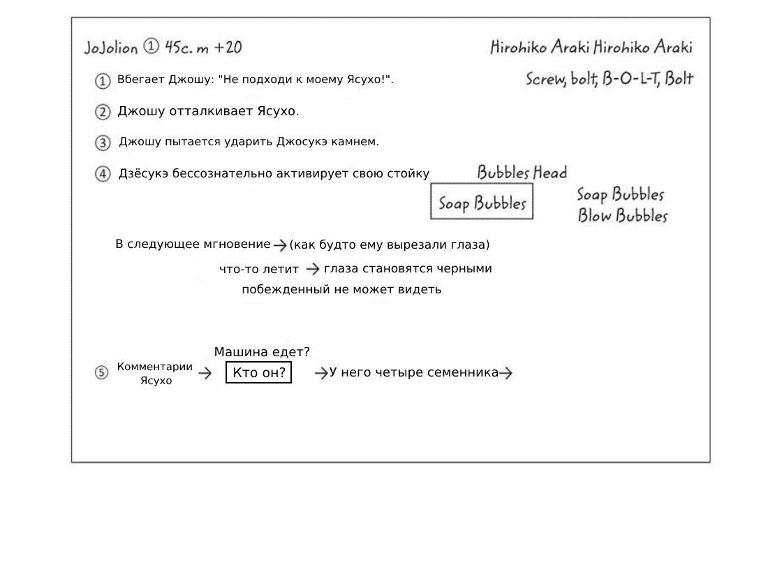 Под этими заметками я написал идеи для Стенда Джоске в виде мыльных пузырей. В верхнем правом углу, где я написал "винт, болт", были идеи для Стенда Джошу, хотя он не появляется в этот момент в истории. Часть внизу, где я написал "комментарии Ясухо", это заметки о том, как закончится глава.