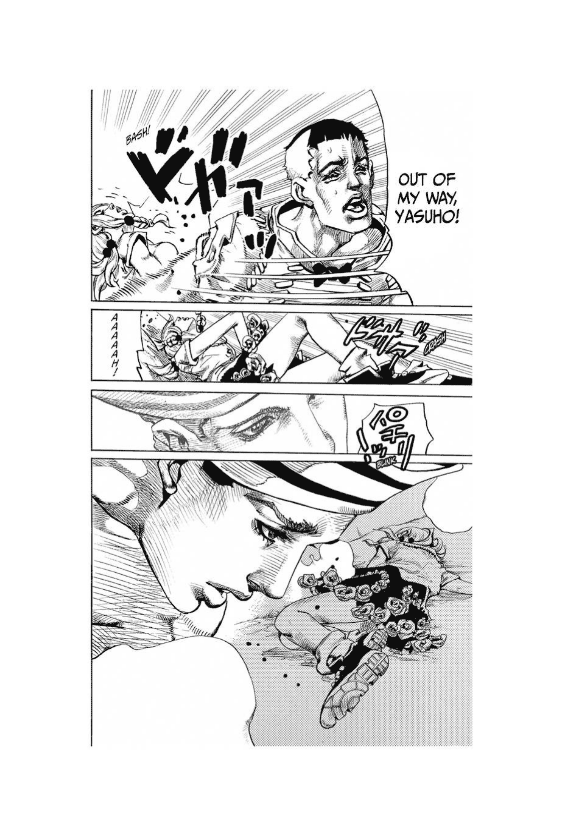 В этой сцене, которую я описываю на двух страницах, Джошу грубо толкает Ясухо в сторону, а затем Джоске видит это и разгневается.