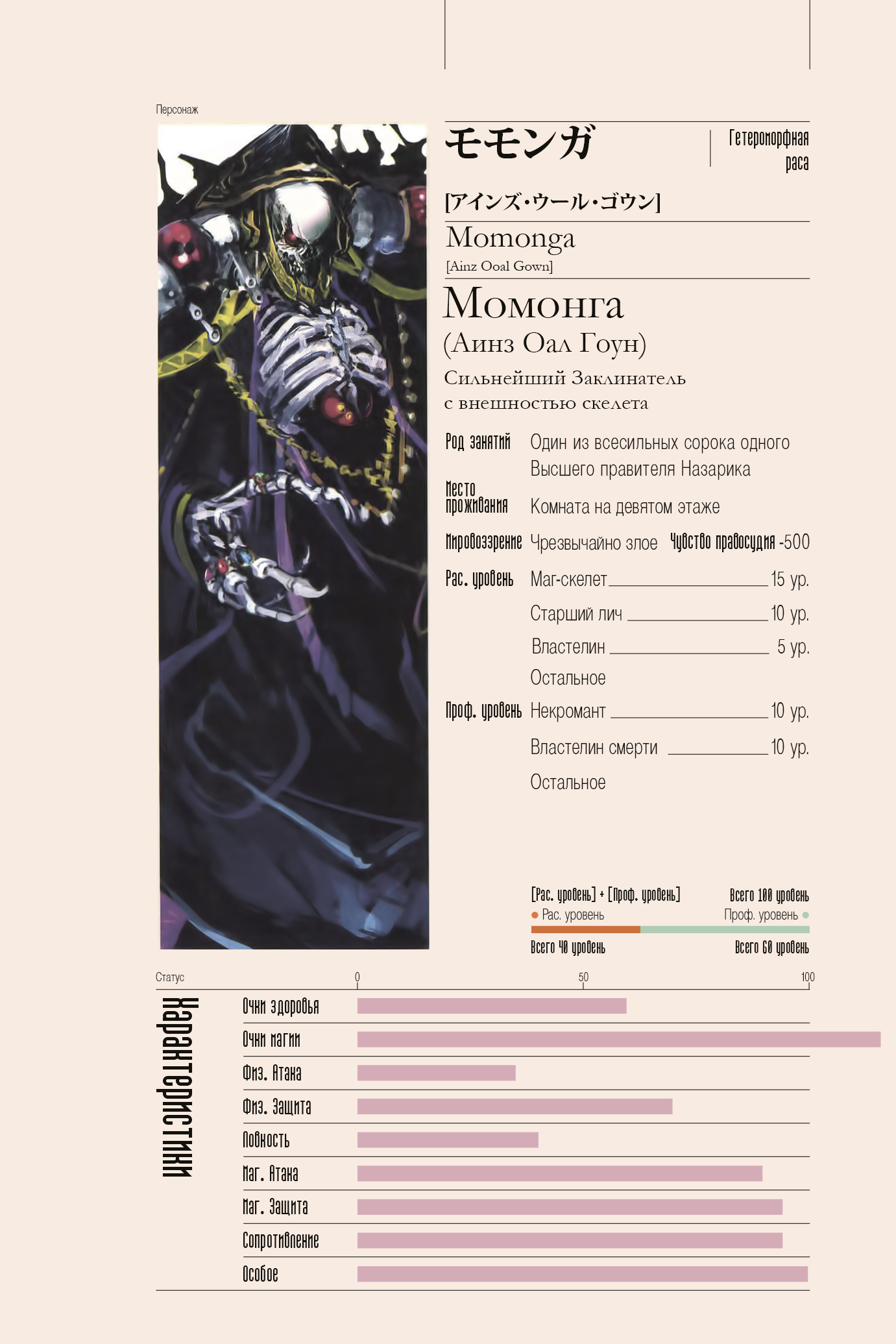 Как видите, я сделал его смесью мага смерти, танка и мастера меча. Обычно в Иггдрасиле, такой билд не может стать сильным, но это же фанфик. И, конечно, его магия мгновенной смерти намного сильнее, чем у Аинза. Мне очень понравилась магия мгновенной смерти в аниме и веб-новелле, поэтому я подумал, почему бы не сделать и моего гг - магом смерти? Думаю, это круто.